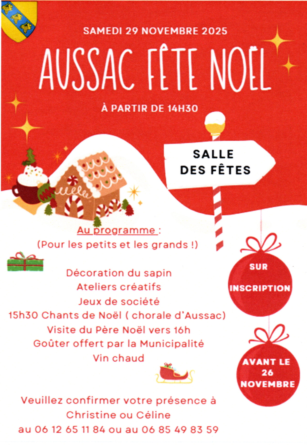 Le Père Noël vous invite à participer au Noël des petits et des plus grands le samedi 29 novembre à partir de 14h30 à la salle des fêtes (sur inscription avant le 26 novembre). Voir le programme des festivités : Aussac fête Noël 2025