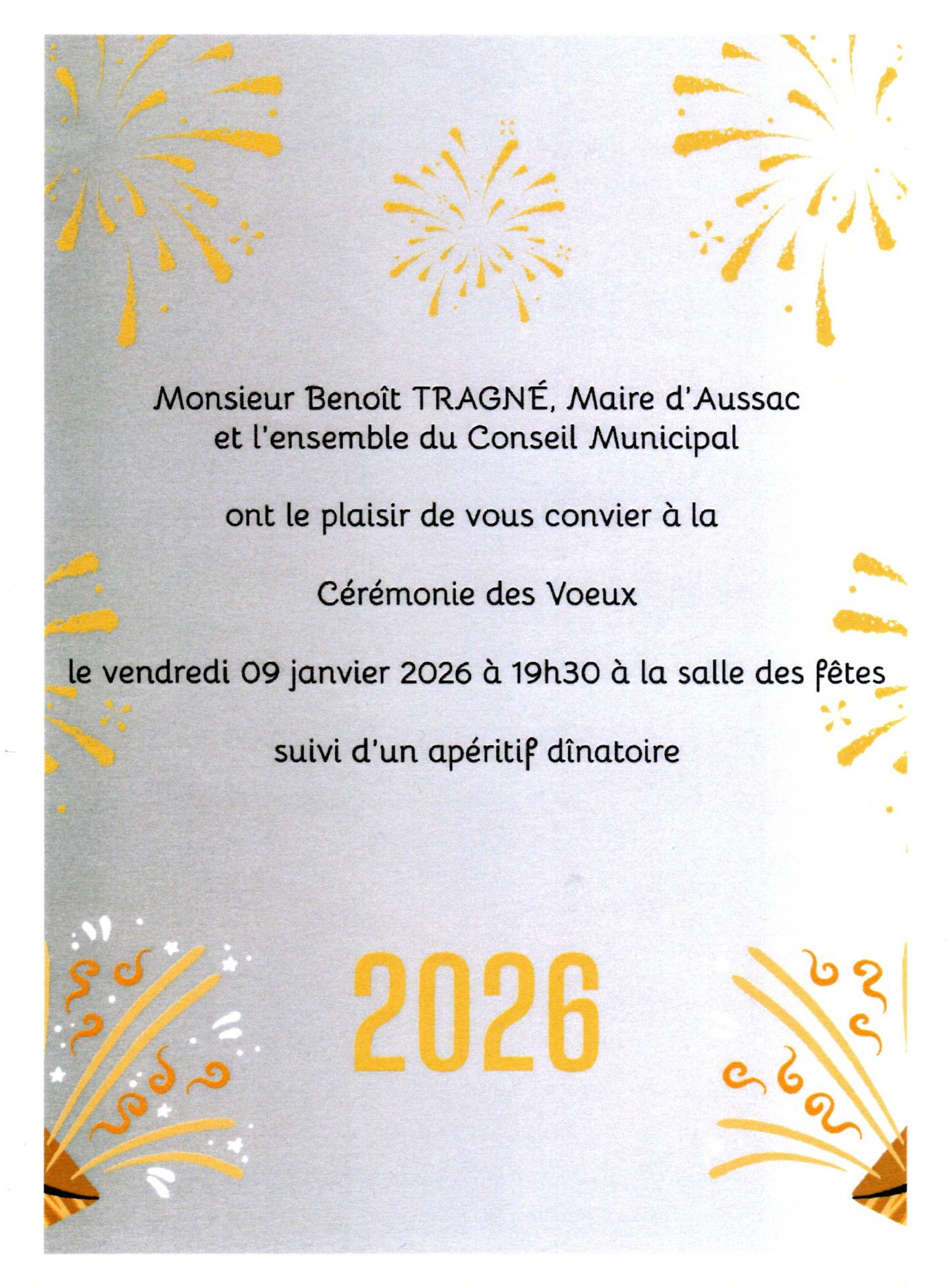 Monsieur Benoit Tragné, Maire d'Aussac et l'ensemble du Conseil municipal ont le plaisir de vous convier à la cérémonie des voeux le vendredi 9 janvier à 19h30 à la salle des fêtes, cérémonie suivie d'un apéritif dinatoire : Voeux 2026